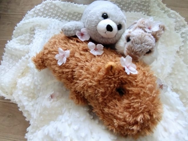外での撮影はぬいぐるみが汚れ対策にシートやテーブルを使うのがおすすめだよ!