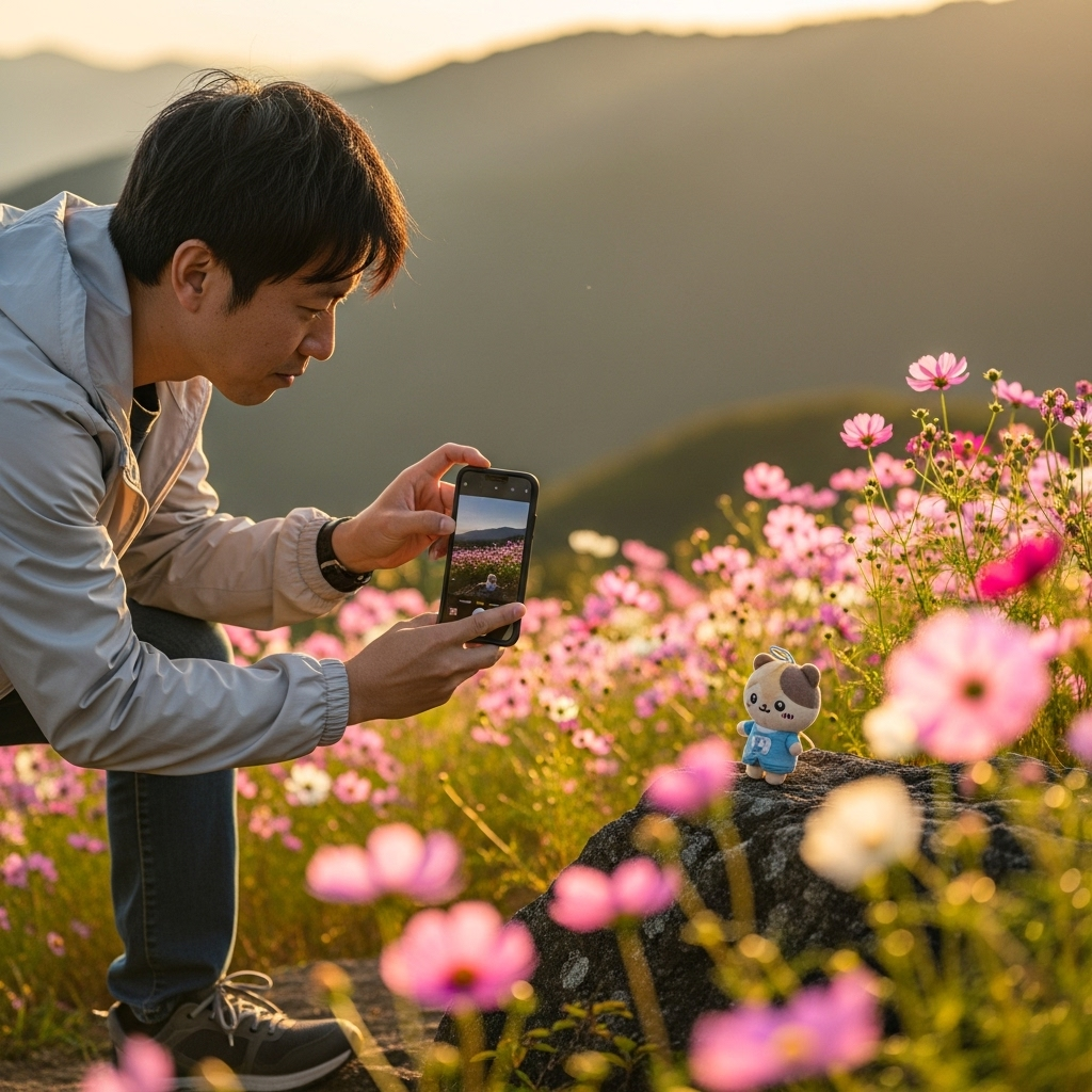 コスモス畑やフラワーパークの秋イベントは、柔らかい花の背景がぬいぐるみに優しい雰囲気を与えます。