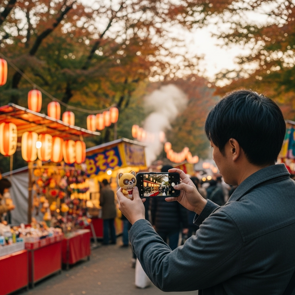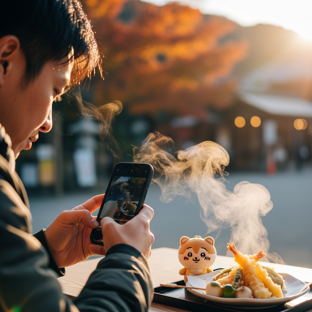 紅葉名所や温泉地の周辺には地元グルメや屋台が並び、食べ物を背景にした“ぬいぐるみと食”の写真が撮れます。