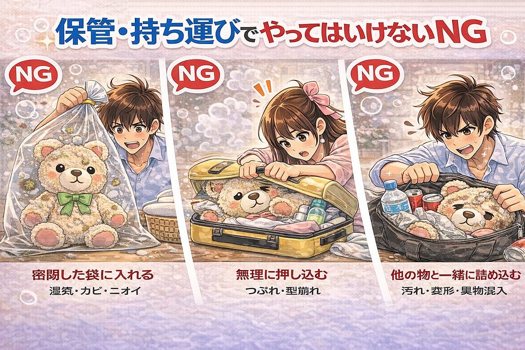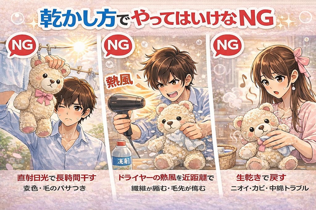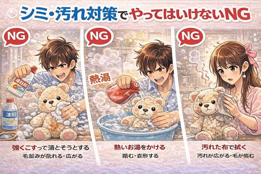 この記事では、ぬいぐるみのお手入れでやってはいけない行動を「なぜNGなのか」という原因とセットで整理します。