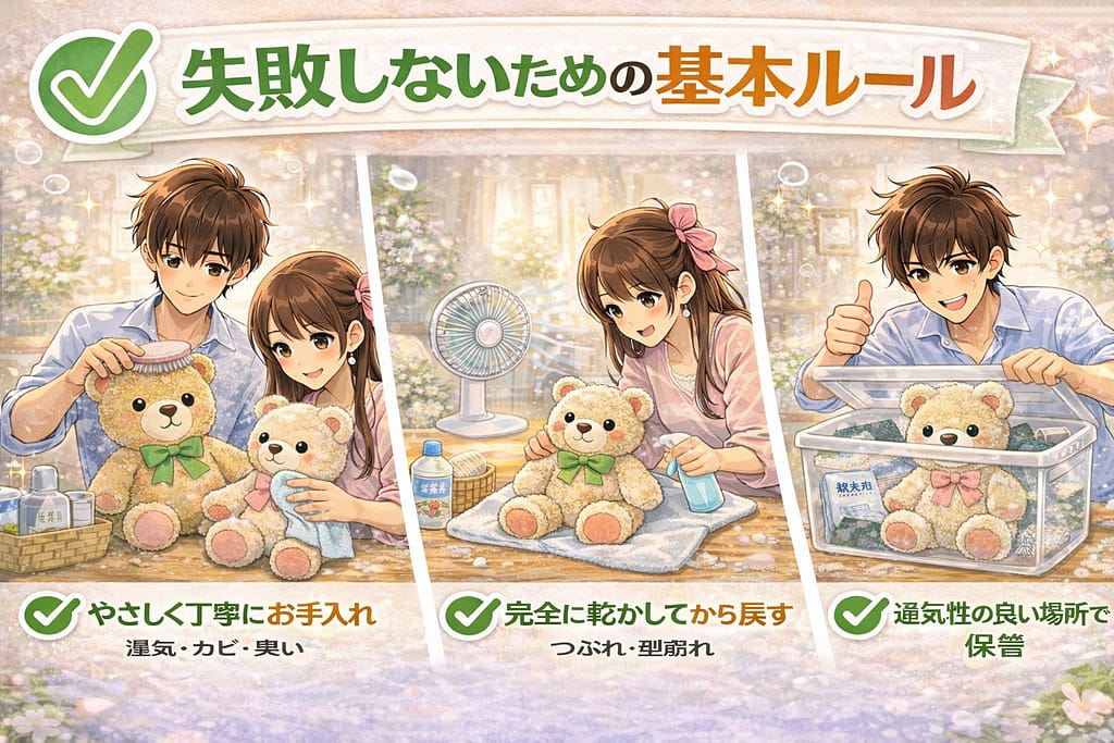 ぬいぐるみのお手入れで迷ったときは、“優しく・少なく・段階的に”を思い出すと失敗しにくいです。