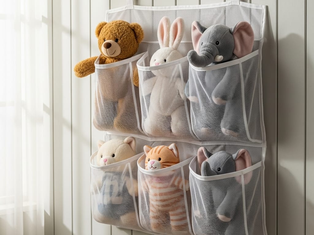 クローゼットやドアに吊り下げるタイプの収納ポケットは、小物やマスコットサイズのぬいぐるみの収納に最適です。