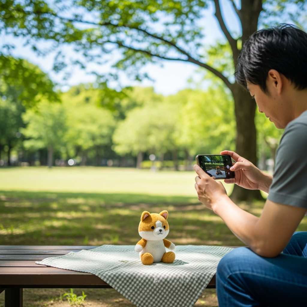 屋外でぬい撮りをする際、ぬいぐるみを直接地面やベンチに置くのは汚れが気になります。