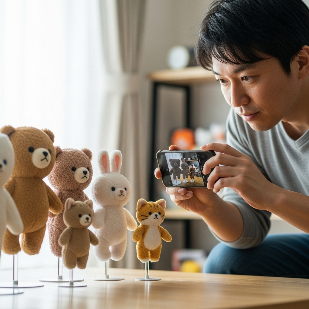 ぬいぐるみスタンドや、背中を支えるためのワイヤーなどがあれば、ポージングの幅が格段に広がり、思い通りの構図で撮影できます。