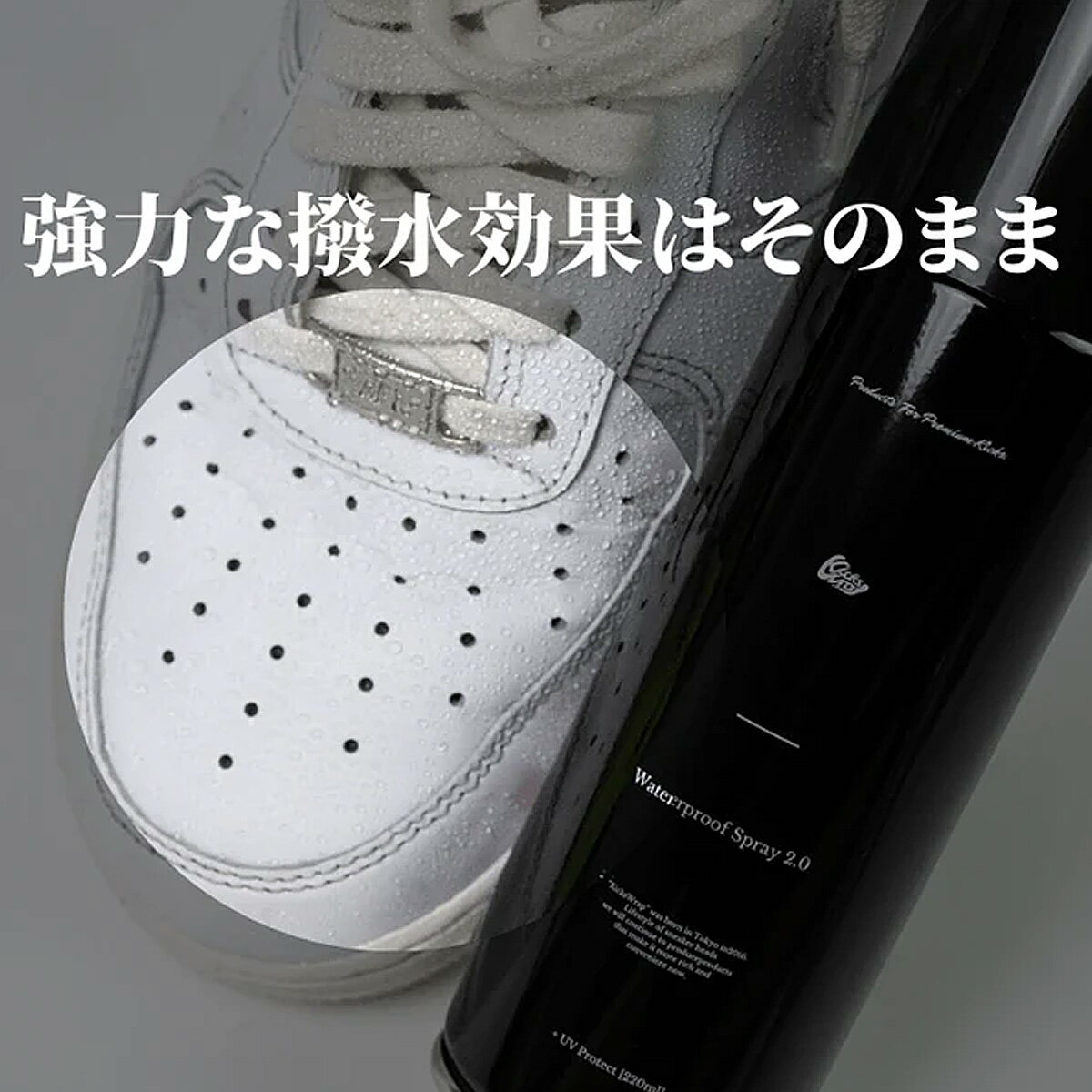ファブリックとレザーの組み合わせ素材向けに設計され、通気性を保ちながら撥水性を回復させる意図が説明されています。