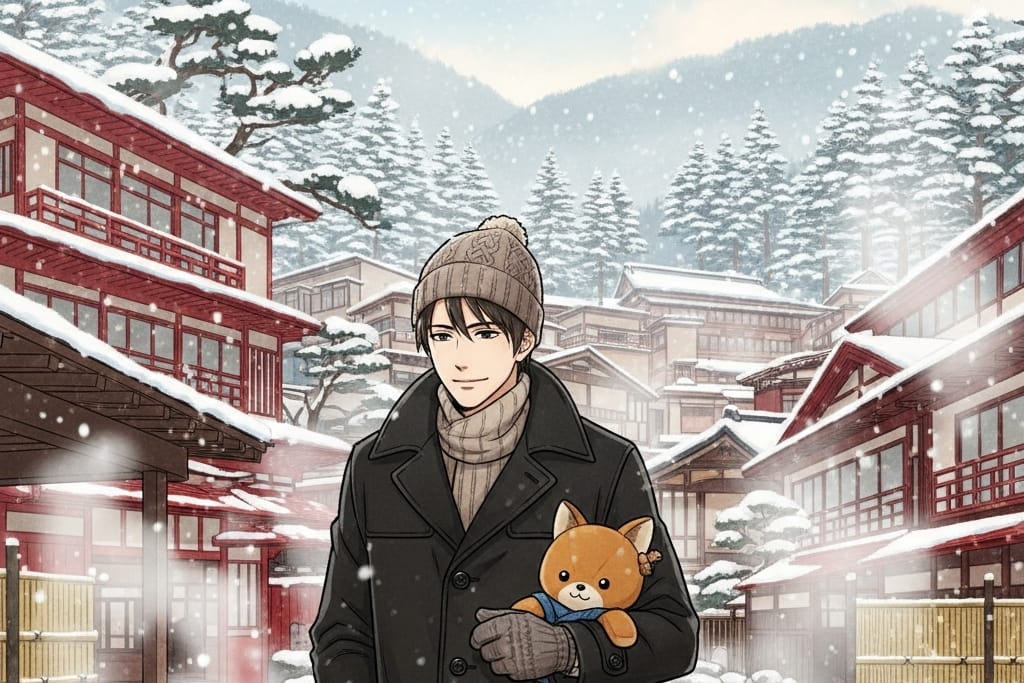 雪に包まれた公園や山の麓、温泉街などは冬のぬい活に最適です。