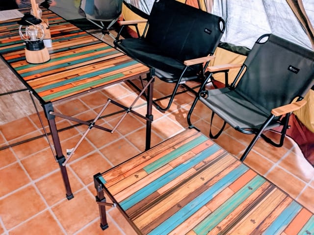 テーブルとチェアをセットで使うことで、地べたに座るよりも快適に過ごせます。