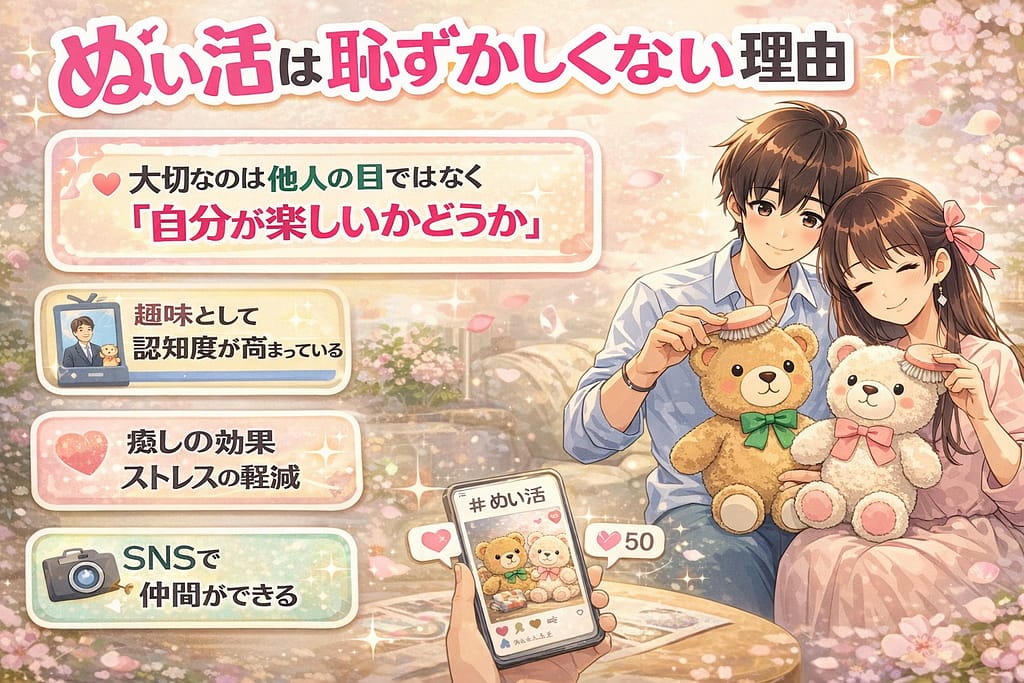 ぬい活は恥ずかしい趣味ではなく、大人の毎日に癒しと楽しさを与えてくれる素敵な活動です。